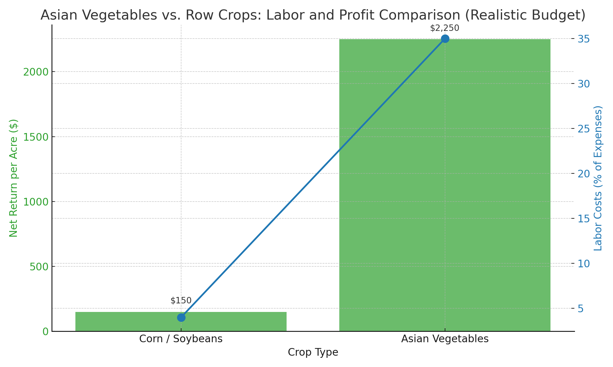 Compare that to row crops. Corn and soybeans follow a familiar rhythm: plant, spray, harvest, store. Systems are well-established. Asian vegetables demand more - but they also deliver more, if you have the right support.